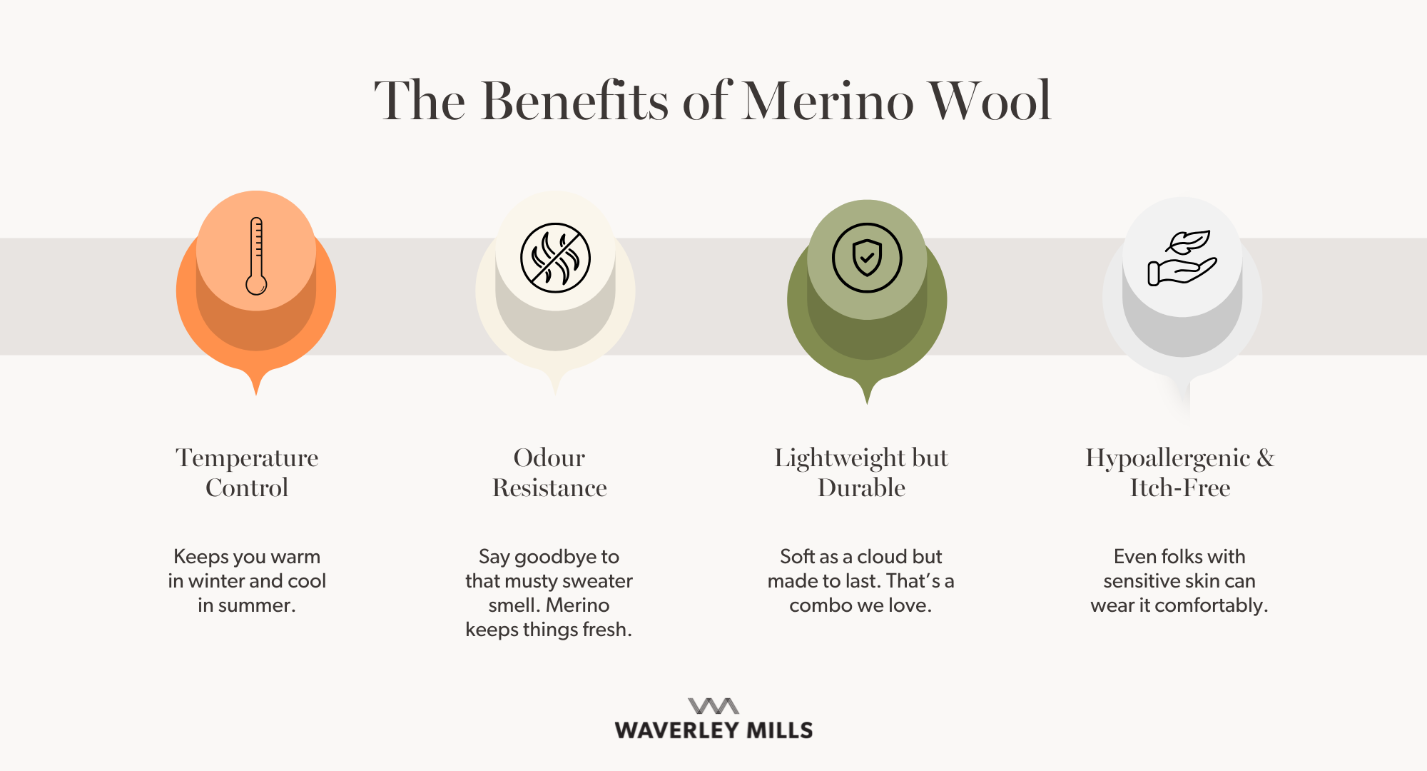 Merino wool is a high-performance fibre that has unique thermoregulation properties, which keep your warm when it is cold and cool when it is warm. The wool fibre has two tools to manage temperature — its natural crimp (or wave) and an ability manage moisture.