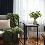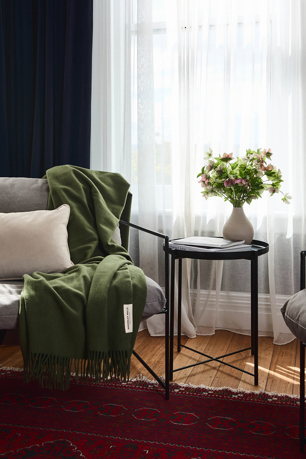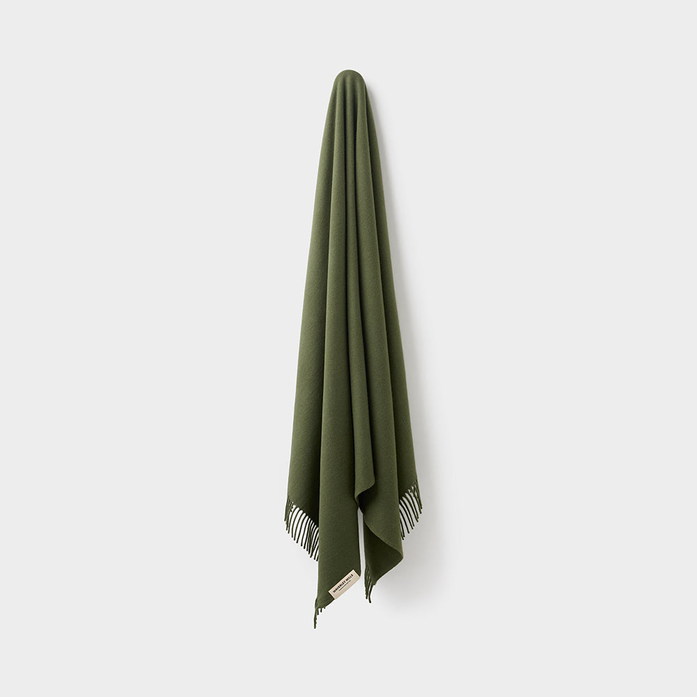 An embodiment of pure comfort in our new versatile olive green. Elevate your relaxation experience, envelop yourself in style, and redefine cosiness with this must-have pure wool throw.