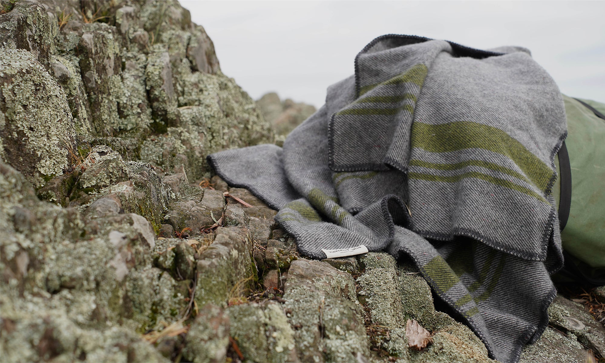 Recycled wool field blanket in charcoal and grey with green stripe